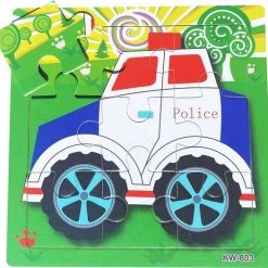 Set van 2 houten legpuzzels van een vliegtuig en een politie auto. Alle twee de puzzels bestaan uit 9 stukjes.