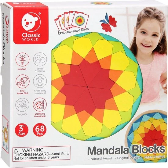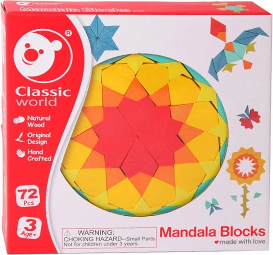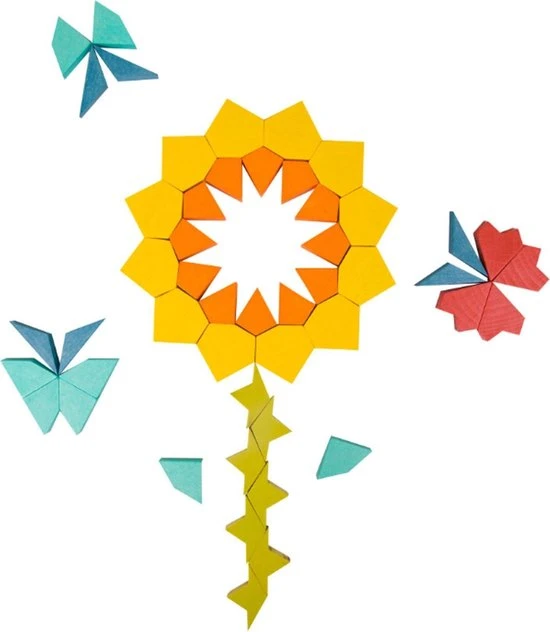 – 66 gekleurde blokken in verschillende vormen (12 blauw, 12 turkoois, 12 groen, 12 geel, 12 oranje en 6 rood)