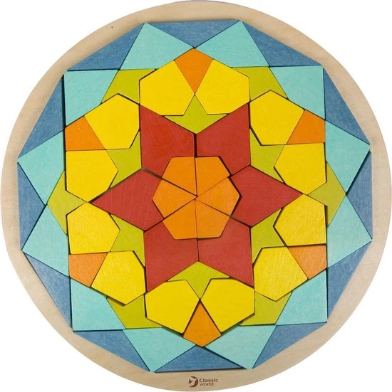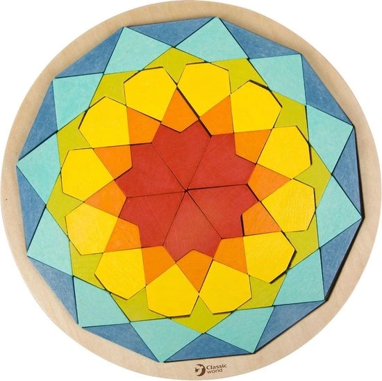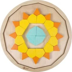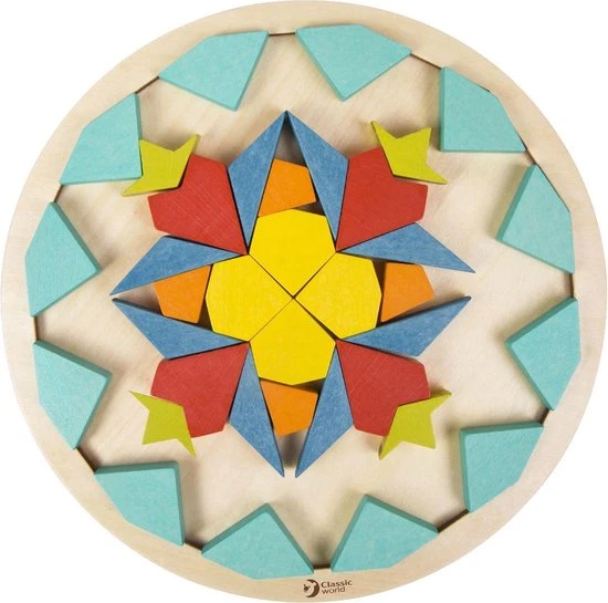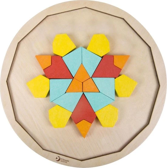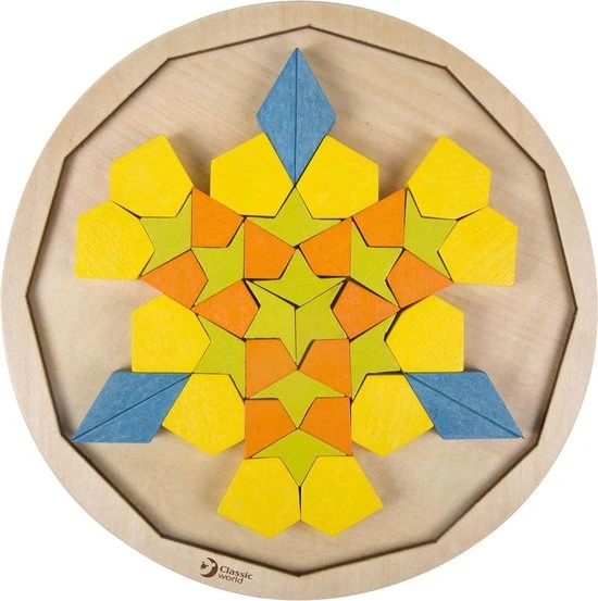 – een houten basis met speciaal geprepareerde, geslepen randen aan de binnenkant om het mogelijk te maken de blokken op een cirkelvormige plattegrond te rangschikken,