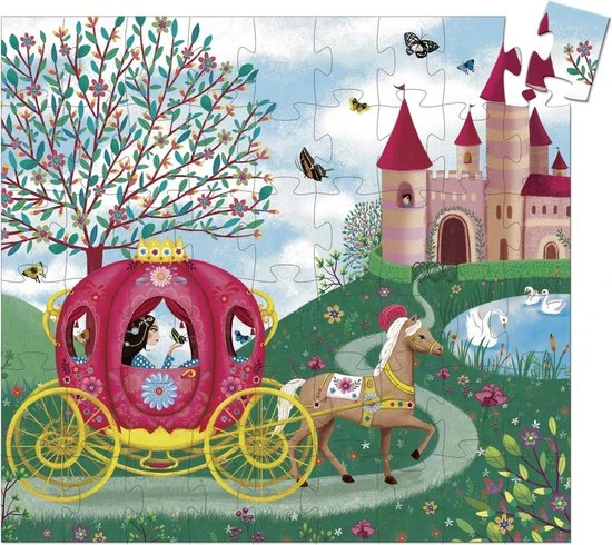 Een betoverende doos met adembebemende Djeco puzzel. De puzzel is 40 x 37 cm groot en heeft 54 puzzelstukje. Elise gaat per koets naar haar paleis en de vlinder vliegen met haar mee.