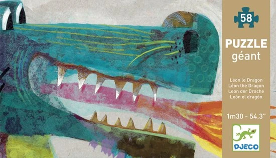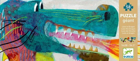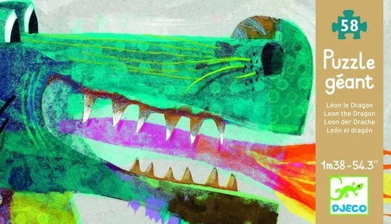 Een stoere puzzel van Djeco van Leon de draak. Deze grote puzzel is 138 cm breed! De vloerpuzzel bestaat uit 58 grote puzzelstukken.