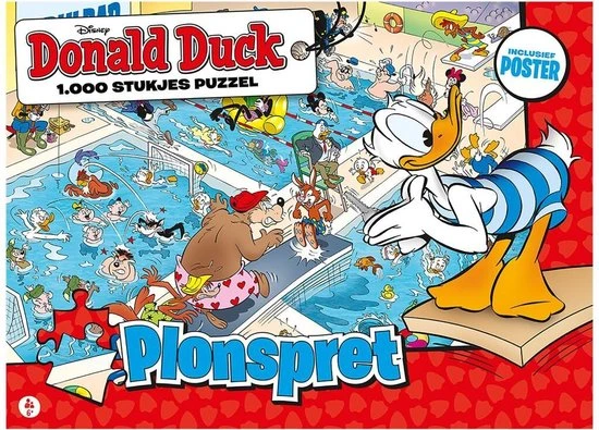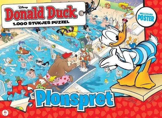 PLONSPRET Donald Duck is het vrolijkste weekblad van Nederland! Beleef de spannende en grappige avonturen van Donald en zijn neefjes, Katrien, oom Dagobert, de Zware Jongens en andere inwoners uit Duckstad. De puzzel is opgebouwd uit 1.000 stukjes en is geschikt voor puzzelaars van 6 tot 106! In Duckstad kan zelfs een zwemwedstrijd in het water vallen. Maar met een beetje denksport kun jij deze plonsplaat weer compleet maken. Ben je klaar met alle stukjes? Dan mag je jezelf puzzelkampioen noemen!