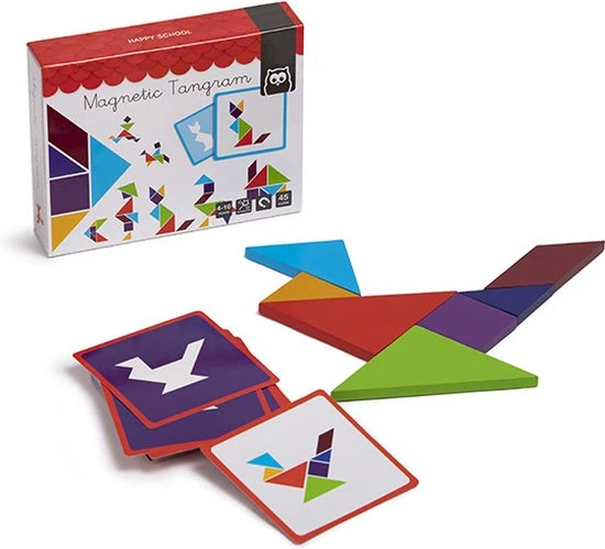 Tangram is een educatief logisch spel om vormen te leren en plezier te hebben. De houten stukken zijn magnetisch om op een magneetbord, koelkast of metalen oppervlak te spelen. Het bevat 45 kaarten met voorbeelden van composities, gekleurd voor de gemakkelijke versie en met alleen het silhouet op de achterkant om het spel extra moeilijk te maken. De combinaties van de stukken zijn eindeloos!