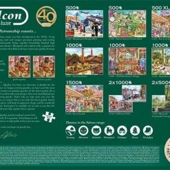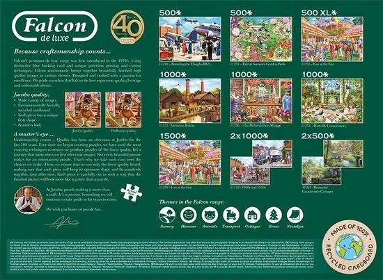 De legpuzzel bestaat al sinds de 18de eeuw, maar de Falcon de luxe-serie kwam voor het eerst op de markt in de jaren 1970. Falcon puzzels hebben een karakteristieke blauwe achterkant, zijn zeer nauwkeurig bedrukt, uitgesneden en prachtig afgewerkt. Falcon brengt continue hoogwaardige afbeeldingen uit in diverse thema?s.