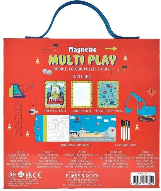 Floss & Rock Magnetische Speeldoos, Bouw. Deze handige doos bevat maar liefst 4 magnetische spellen, zoals een puzzel en diverse tekenborden en magnetische figuren. De set wordt geleverd inclusief 4 uitwisbare stiften. De leuke figuurtjes bestaan onder andere uit diverse vrachtwagens, verkeerskegel en bouwvakkers. Garantie voor urenlang speelplezier! Door de magneten en de compacte vorm van de doos handig voor onderweg of op vakantie. Een waanzinnig leuk cadeau voor een verjaardag of de feestdagen.