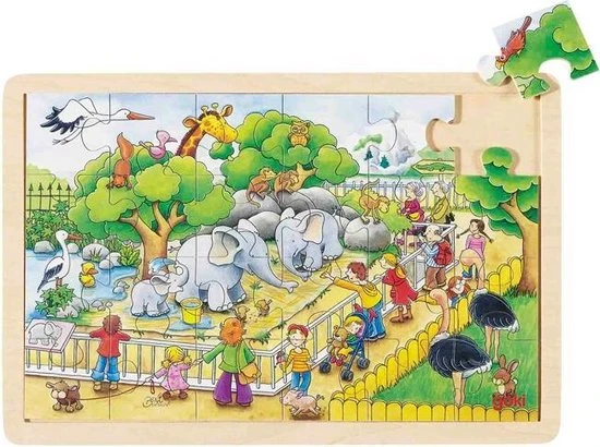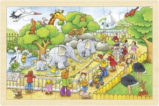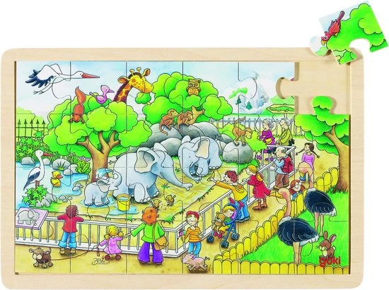 Houten raampuzzel op bezoek in de zoo van het merk Goki.