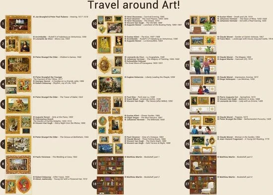 Meer dan 50 schilderijen van onder andere van Gogh, Klimt, Arcimboldo, Brueghel, Monet en Leonardo da Vinci.
