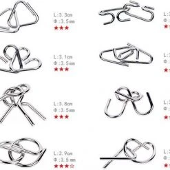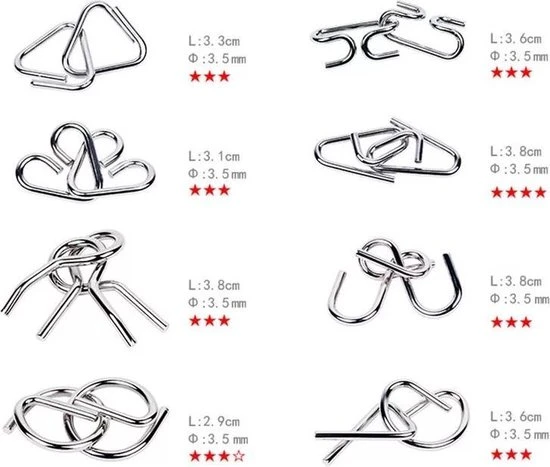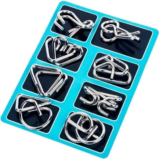 Met deze klassieke hersenkrakers van metaal ga je de strijd tegen de verveling aan. De 8 denkpuzzels met verschillende moeilijkheidsgraden bestaan elk uit 2 metalen puzzelstukken en garanderen puzzelpret voor jong en oud!