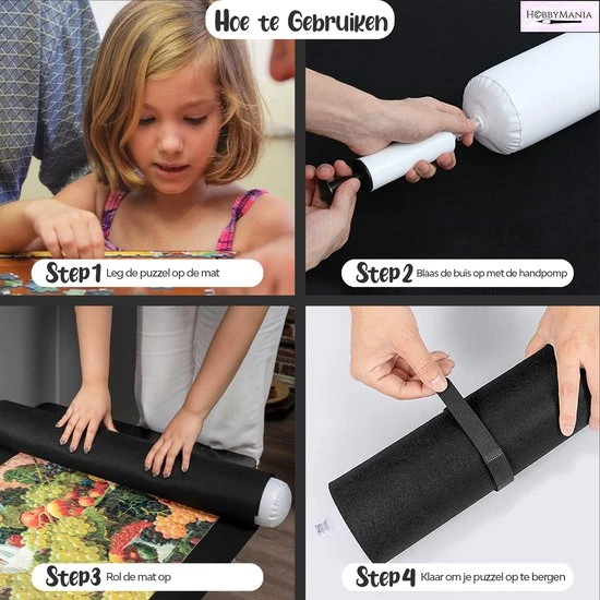 – Om je puzzel weer op te bergen pomp je de tube op, rol je de mat hier voorzichtig omheen, maak je de opgerolde puzzelmat vast met de riemen en berg je het op in het opbergzakje