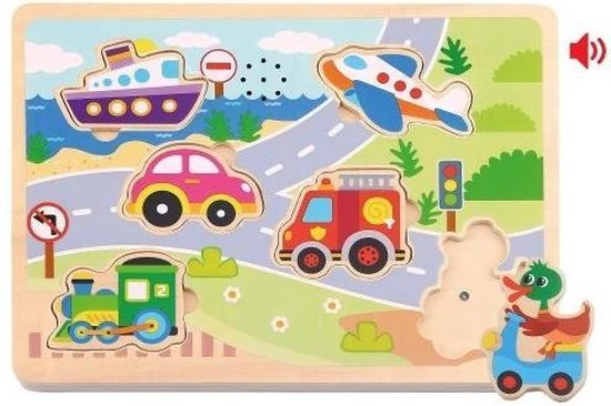 Houten puzzel met 6 met verschillende karakteristieke geluiden. Gemaakt met felle en frisse kleuren die al je aandacht trekken. Leer de geluiden van de beroemdste voertuigen in de stad terwijl je aan je concentratie en oog-handco?rdinatie werkt.