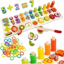 ? VERMAAKT EN ONTWIKKELT -De educatieve set bevat 78 kleurrijke blokken in de vorm van fruit, cirkels, cijfers en speciale tekens. Elk van de blokken heeft niet alleen een andere vorm, maar ook kleur en toepassing. Ze kunnen worden gesorteerd, op elkaar worden gestapeld, op een plaats worden gezet die voor hen is aangewezen, en de vruchten kunnen ook met een houten mes worden gesneden. Dankzij deze voordelen zal de sorteerder uw kind veel plezier bezorgen en tegelijkertijd zorgen voor zijn ontwikkeling en vroege leren.