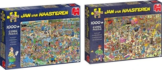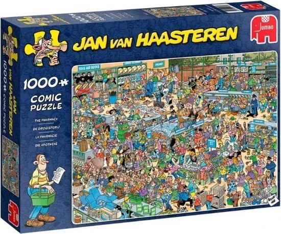 Jan van Haasteren De Drogisterij Puzzel 1000 Stukjes is een van de nieuwe puzzels van Jan van Haasteren. In deze Drogisterij verloopt niet alles even soepel. De Drogisterij van Jan van Haasteren is een puzzel met 1000 stukjes voor de echte Jan van Haasteren fans! Zodra je Jan van Haasteren de Drogisterij met 1000 Stukjes begint te puzzelen stuit je op het ene na het andere hilarische tafereel.