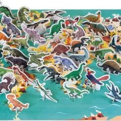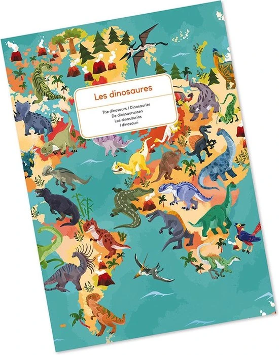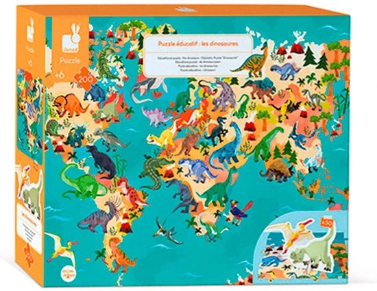 Kartonnen reuzenpuzzel van 200 stukjes met dinosaurussen als thema. Puzzel vergezeld van een leerboekje om kennis te maken met de wereld van de dinosaurussen en hen beter te leren kennen. 50 kartonnen dieren om in elkaar te zetten en op de puzzel te plaatsen. De naam van de dinosaurussen is aan de achterkant van elke figuur vermeld.