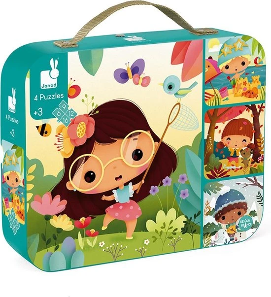 4 kartonnen puzzels van 6, 9, 12 en 16 stukjes met de vier seizoenen als thema. Wordt verkocht in een mooie geschenkdoos met een stoffen handvat. Afmeting puzzel: 20 x 20 cm. Geschikt voor kinderen vanaf 3 jaar.