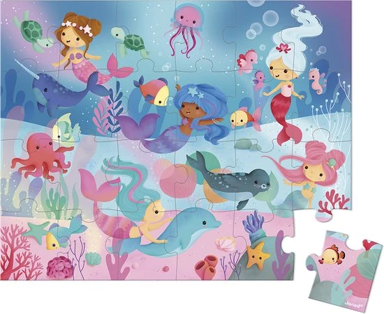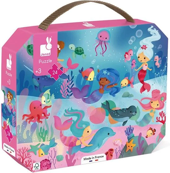 24-delige kartonnen puzzel op basis van het zeemeerminnenthema. Verkocht in een mooie, ronde kartonnen koffer met een stoffen handgreep en houten slot. Poster inbegrepen om de puzzel eenvoudiger te maken.