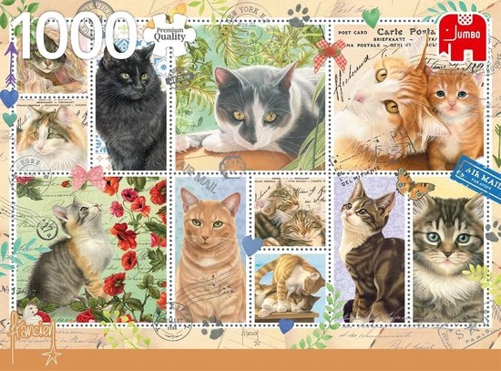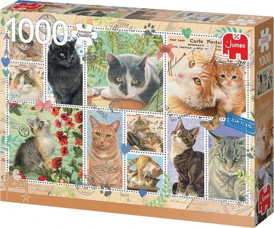 Franciens Katten Cat Stamps Premium Collection Puzzel 1000 Stukjes. Met de Premium Collection legpuzzels van Jumbo beleeft u uren puzzelplezier. Jumbo staat voor ruim 160 jaar kwaliteit en vakmanschap. Voor het maken van de puzzels wordt alleen gebruik gemaakt van het allerbeste gerecyclede karton van verantwoorde herkomst. De puzzels worden gesneden met speciale dunne messen. Hierdoor behoudt elk puzzelstukje zijn optimale pasvorm en zorgen de smalle naden voor een extra glad en bijna naadloos eindresultaat.