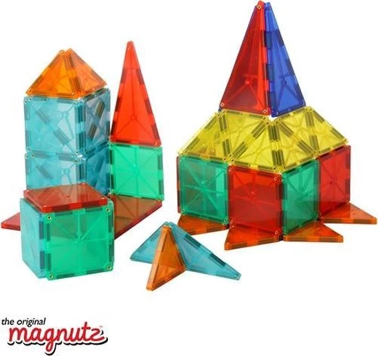 MAAK, BOUW, PUZZEL en CRE?ER! Deze Magnutz met ingebouwde magneten bieden onbeperkte mogelijkheden! Voor ieder kind gaat er een creatieve wereld open, door te maken, bouwen en cre?ren. Dit bouwen gaat heel eenvoudig doordat er in de Magnutz kleine magneten zitten, waardoor deze gemakkelijk op hun plaats blijven zitten. Met het bouwen ontwikkelt uw kind fijne motoriek en stimuleert het ruimtelijk inzicht. De Magnutz stimuleren de creativiteit van uw kind doordat deze iedere keer weer nieuwe creaties kan maken, van een simpele kubus tot steeds complexere (3D) bouwwerken. De Magnutz groeien met uw kind mee en uw kind kan ze ook gebruiken samen met ander speelgoed. Ze geven voldoende uitdaging en urenlang speelplezier! Deze set van maar liefst 48 stuks bevat de volgende Magnutz: Groot vierkant: 2 Klein vierkant: 8 Gelijkzijdige driehoek: 16 Rechte driehoek: 18 Lange driehoek: 4