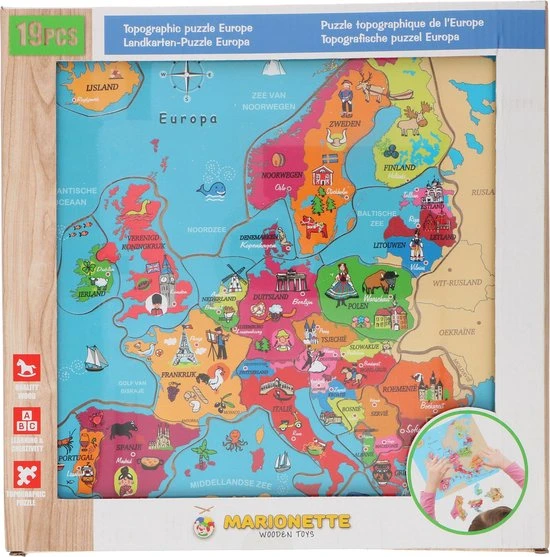 Kinderen zijn nieuwsgierig. Ze willen alles weten en stellen heel veel vragen. Daarom is deze houten puzzel van Marionette Wooden Toys zo’n leuk speelgoed. De puzzel die uit 18 stukjes bestaat, stelt de kaart van Europa voor. Spelenderwijs leert je kind de verschillende landen van Europa kennen.