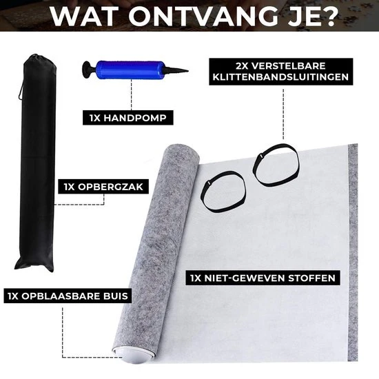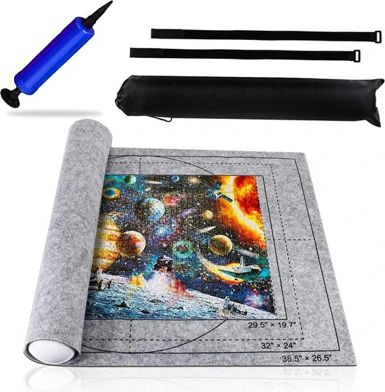 Het gebruik van deze puzzelmat zorgt ervoor dat je ruimte bespaart bij het opbergen. Wanneer je klaar bent met puzzelen, blaas je de buis op en rol je de mat om de buis heen. Bind hierna de mat vast met de elastische bandjes, zodat de puzzel intact blijft. Vervolgens kun je de rol opbergen zonder dat deze veel ruimte in beslag neemt!