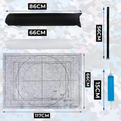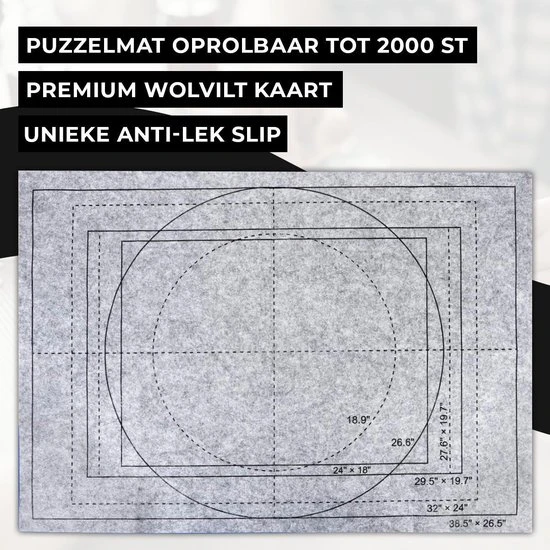 De puzzelmat is ongeveer 117 bij 66 centimeter. Dit is voldoende ruimte voor zo?n 1000 puzzelstukjes. Op de mat staan duidelijke lijnen, zodat je weet waar je moet beginnen met puzzelen en hoe je de puzzel later het beste kunt oprollen.