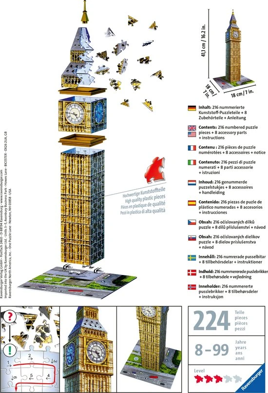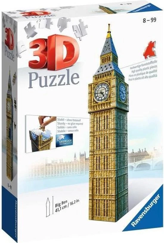 Uniek drie dimensionaal puzzelplezier, dat zijn de 3D gebouwen puzzels van Ravensburger! Puzzel prachtige 3D bouwwerken in elkaar en geef ze een mooi plaatsje op o. a. je wandplank of op het dressoir! De stevige plastic stukjes passen precies in elkaar. Zo bouw je vanuit gebogen, platte en vouwbare stukjes een uniek model van de Big Ben, zonder lijm te gebruiken!