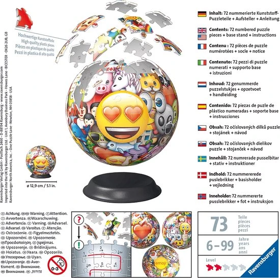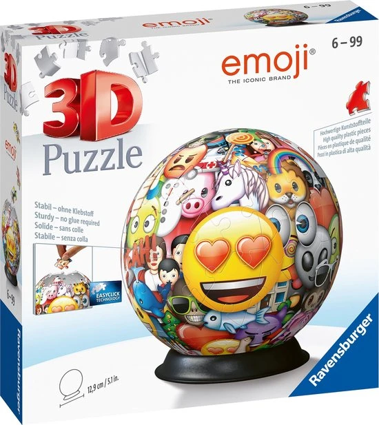 Uniek drie dimensionaal puzzelplezier, dat zijn de 3D puzzels van Ravensburger! De stevige plastic stukjes passen precies in elkaar. Zo bouw je vanuit 72 gebogen stukjes de unieke afbeelding van Emoji, zonder lijm te gebruiken!