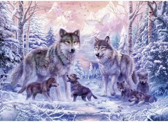 Prachtige puzzen van wolven in een sneeuwlandschap. Deze Ravensburger puzzel bestaat uit 1000 stukjes en is erg gedetailleerd. De puzzel heeft prachtige kleuren en toont een wolvenfamilie met vader, moeder en babywolven.