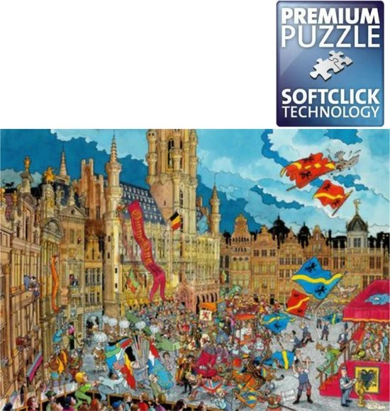 In Brussel wordt elk jaar in juli De Ommegang gevierd. Twee dagen lang wordt bij het vallen van de avond op de beroemde Grote Markt een historisch spektakelstuk opgevoerd dat zijn weerga niet kent. Met behulp van meer dan tweeduizend figuranten wordt de intocht nagespeeld van keizer Karel V en zijn gevolg in 1549. Maar als Frans Le Roux dit gaat tekenen verloopt het wapperen met historische vlaggen natuurlijk niet zo gladjes als gewenst! Brussel is ook de hoofdstad van Europa, dus Europese vlaggen zouden toch ook een rol moeten spelen….? Maar daar is keizer Karel niet van gediend, hij verkiest liever de historische werkelijkheid. Natuurlijk zijn ook onze vaste gasten Bob en Nancy weer van de partij. Bob wil als rechtgeaarde Amerikaan ook nog een bijdrage leveren aan het vlagvertoon. Maar of hij daarin slaagt zie je als je pas als je de puzzel af hebt! Bevat 1000 stukjes.