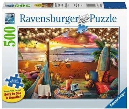 Deze Ravensburger puzzel met grotere puzzelstukken is eenvoudiger te leggen. Het resultaat is een kunstwerk van groot formaat. Jong en oud zullen genieten van de Cozy Cabana Puzzel van 500 (extra grote) stukjes