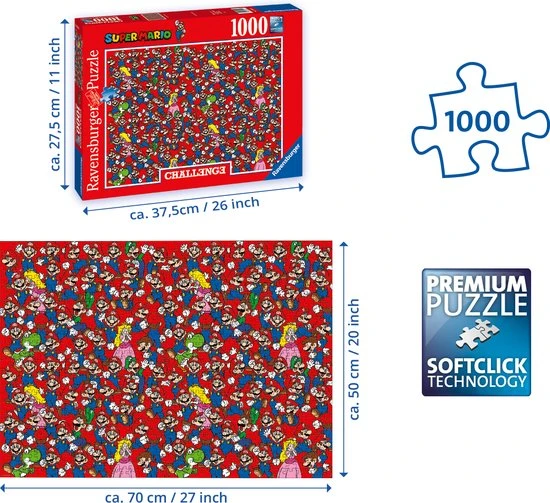 Ontsnap uit de realiteit en stap in de wereld van Ravensburger puzzels. Deze Ravensburger puzzel van 1000 stukjes is geschikt voor zowel beginnende als ervaren puzzelaars. En omdat onze geliefde puzzels een standaard formaat hebben, kun je het resultaat inlijsten en ophangen. Dankzij de met de hand gemaakte stansmessen is de vormvariatie van de stukjes oneindig. Jong en oud zullen genieten van deze Super Mario puzzel met 1000 stukjes.