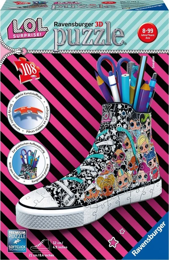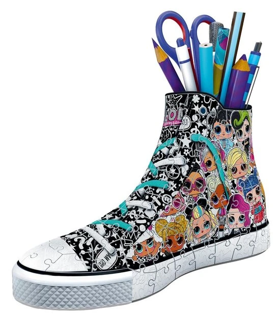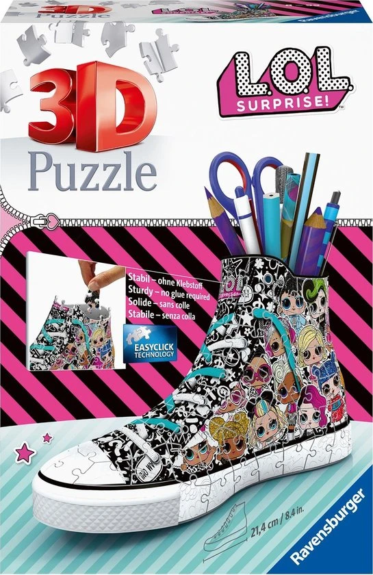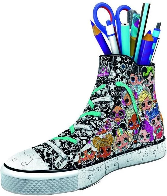 Gewoon uniek! Met 108 stevige kunststof puzzelstukjes ontstaat een sneaker met een cool design – de perfecte decoratie voor je kamer! Handig: na het puzzelplezier kan de sneaker gebruikt worden als praktische opbergplaats. Zo kun je alle dingen opbergen die je liever niet laat rondslingeren!