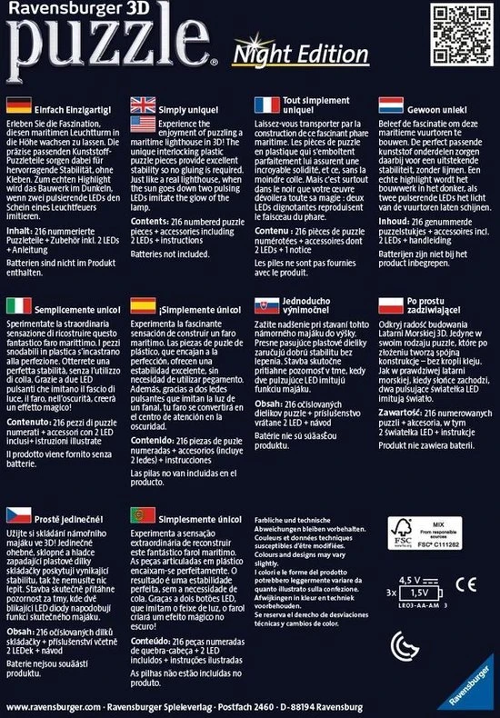 | Verpakkingsinhoud | 216, puzzelstukjes, +, bouwonderdelen, +, lampunit+, handleiding, met, afbeeldingen., Batterijen, zijn, niet, bij, het, product, inbegrepen. |