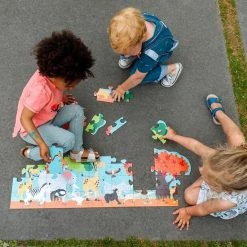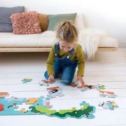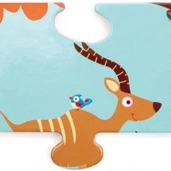 Scratch Vloerpuzzel Safari. Deze grote vloerpuzzel met als thema safari bestaat uit 36 puzzelstukken, afmeting 100 cm op 33 cm. Op de puzzel zien we een aantal typische dieren die we op safari door de Afrikaanse savannes ook kunnen ontmoeten. We herkennen o.a. giraffen, een zebra, olifanten, flamingo’s, apen, een neushoorn, leeuw, ooievaar en een schildpad.Deze kwalitatieve puzzel vol exotische dieren zal dan ook in de smaak vallen bij kindjes vanaf 3 jaar.