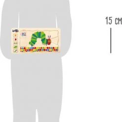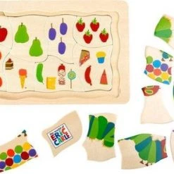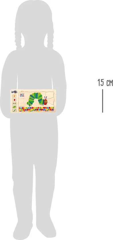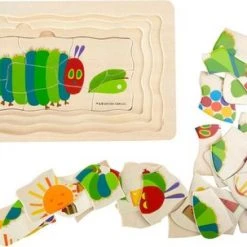 De Rupsje nooitgenoeg – beroemd van het kinderboek van Eric Carle – staat op deze superlaag-puzzel. De afbeeldingen aan de linkerkant zijn verborgen onder de vier lagen en worden langzaam zichtbaar.