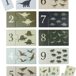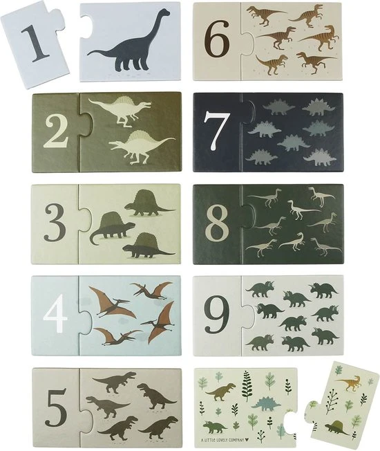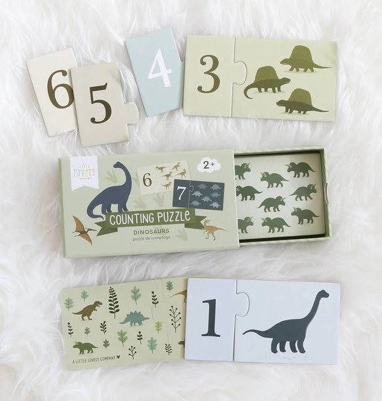 Leer tellen van ??n tot tien met deze leuke dinosaurus puzzelset. De set bestaat uit 10 losse puzzels. Op het ene puzzelstukje staat het cijfer en op het andere het aantal dinosaurussen dat bij het cijfer hoort.